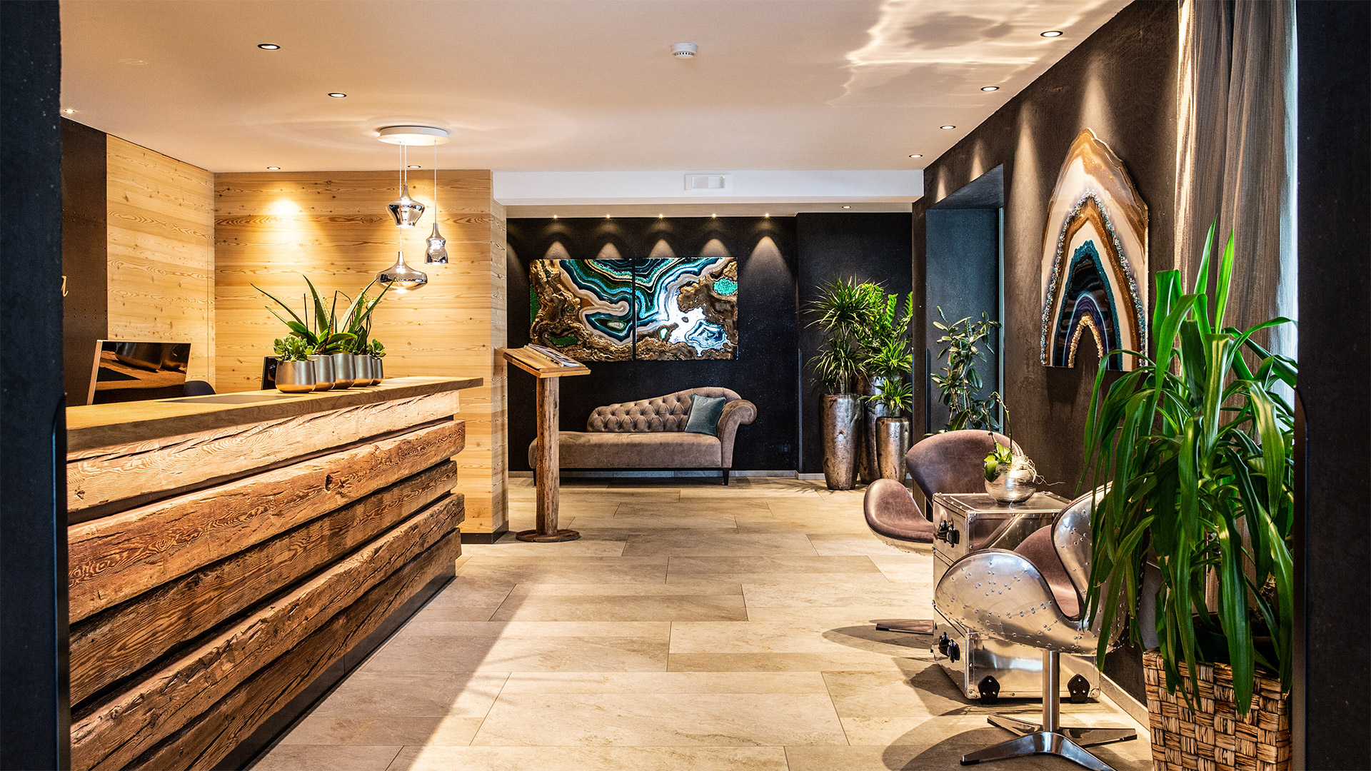 Die Hotelrezeption zeichnet sich durch Holzbalken aus, die aus einem alten Bauernhof aus dem Gadertal stammen, und heißt die ankommenden Gäste herzlich willkommen.